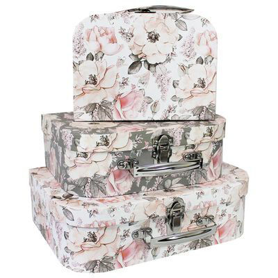 Set of 3 A gorgeous set of three grey/pink floral storage suitcases in small, medium and large size. With a burst of flowers on each design, each case features a small silver carry handle and secure metal clasp fastening. The storage suitcases can be stacked and stored when not in use for a compact storage solution. Measurements: • Large case measures: 30 x 20.5 x 9cm • Medium case measures: 25 x 17.5 x 8.5cm • Small case measures: 20 x 14.5 x 8cm A great way of storing knick-knacks, books and even craft items, these lovely cases would look beautiful in any room.