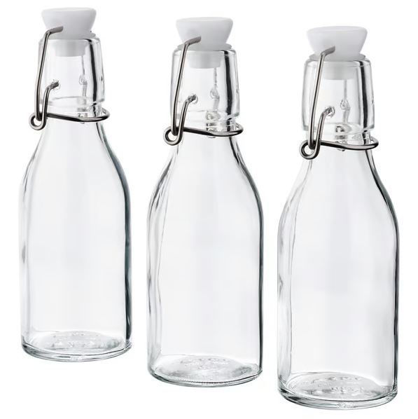 This small bottle with a stopper is perfect for serving milk for your breakfast, or fill it with olive oil, vinegar, soy or other condiments and place on the dinner table. Tight-fitting stopper that prevents leakage. Material: Body: Glass. Lid: Polypropylene plastic. Seal: Synthetic rubber. Wire: Stainless steel. Care: If you want to sterilize the bottle with hot water, preheat the bottle first with warm tap water. This prevents the glass from cracking. Dishwasher-safe up to 70°C. Only for food and beverages with a max. temperature of 70 °C. Height: 15 cm. Volume: 15 ml each bottle. Package quantity: 3 pack.